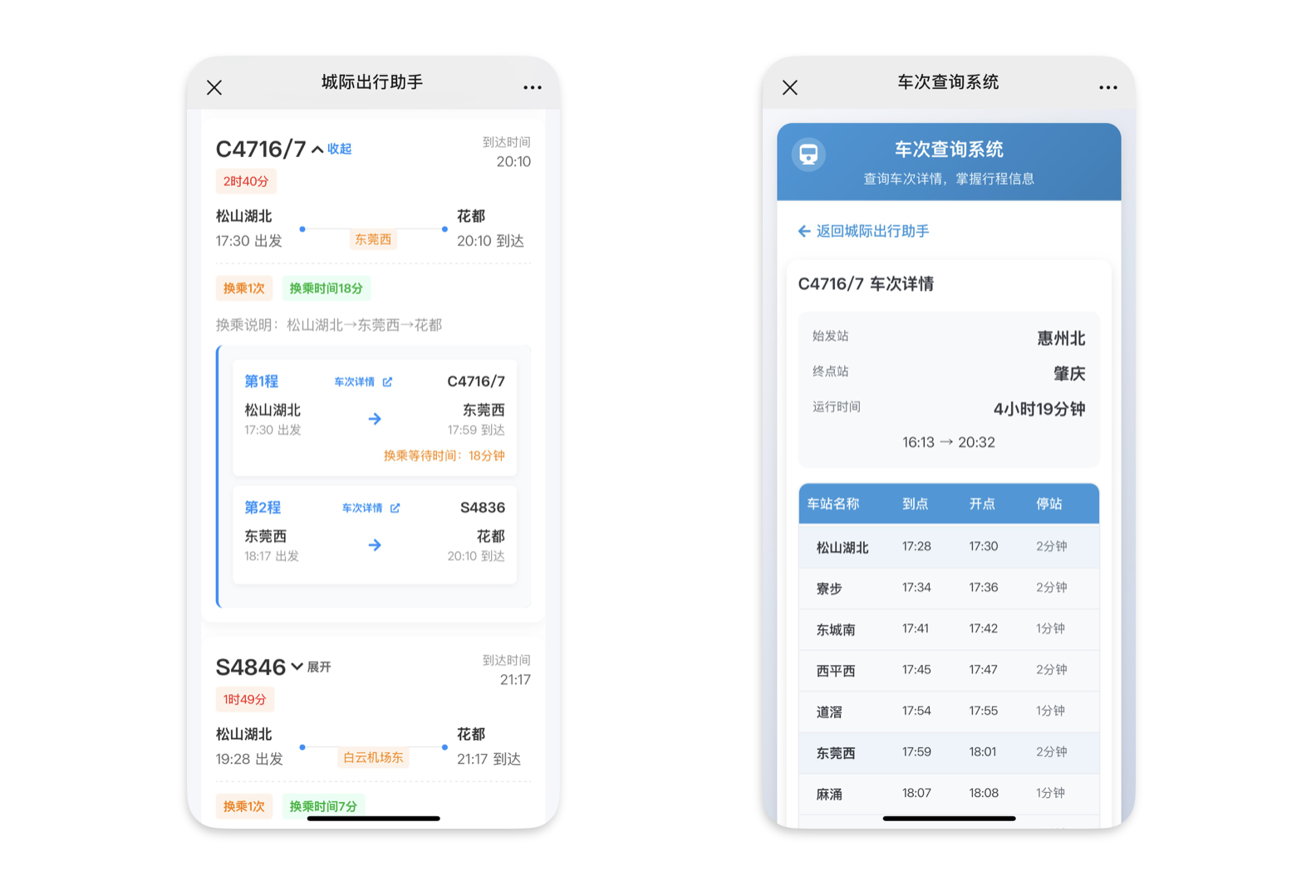 该功能还支持查询指定线路车站在当前时间或者选定时间10分钟后的车次信息,以便旅客合理预留时间乘坐列车。每条推荐路线均提供详细的车次信息、出发与到达时间、换乘站点及换乘等待时间等关键内容。此外,旅客还可点击“车次详情”跳转至时刻表查询页面,进一步了解该车次途经的所有站点及每站的到发时间,轻松规划高效出行。